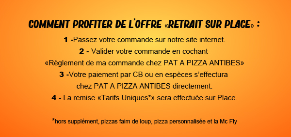 La Commande en ligne est actuellement fermée. Nos horaires HIVER sont les suivantes : De 16h00 à 22h00. Les livraisons et les retraits de vos commandes se font à partir de 18h. Nous sommes fermés les midis... Merci et à très vite ... L'équipe PAT A PIZZA ANTIBES