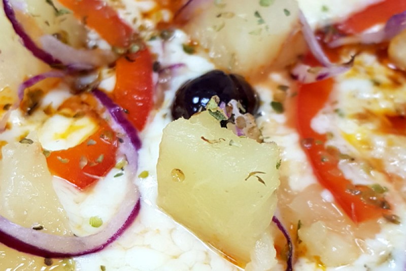 Base tomate, pepperoni, mozza, poivron, oignon et ananas