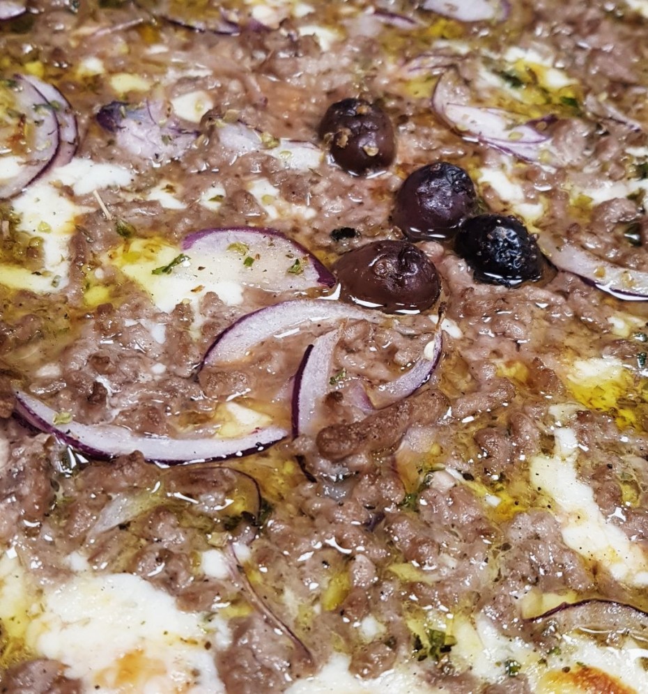 Base tomate, 2xviande hachée charal, oignon rouge, mozzarella, crème, persillade maison