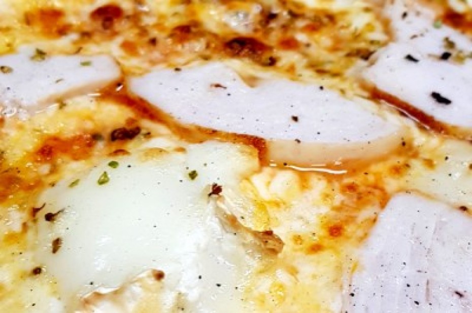 Base tomate, tranchettes de blanc de poulet, mozzarella 100%, chèvre 100%