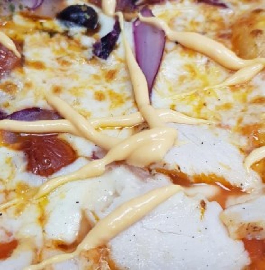 Base tomate, mozzarella moelleuse, tranchettes de blanc de poulet, merguez*, oignon rouge frais et sauce pili-pili.