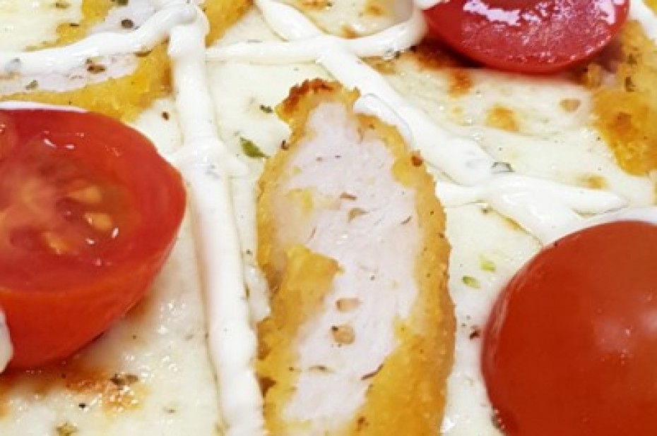 Base crème, 2x de la mozzarella 100%, poulet pané au corn flakes hallal et en sortie de four : Tomates cerises, sauce tartare