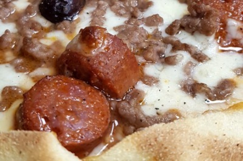 Base tomate, mozzarella moelleuse, viande hachée charal, merguez au Bœuf hallal et crème